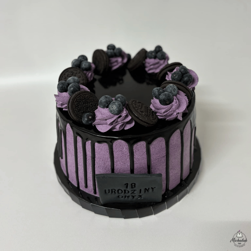 Tort urodzinowy „Oreo” to połączenie intensywnego smaku czekolady z delikatnością kremu i chrupkością kultowych ciastek Oreo. Fioletowa dekoracja z borówkami i polewą z ciemnej czekolady sprawia, że tort zachwyca nie tylko smakiem, ale i wyglądem – idealny na każdą wyjątkową okazję. -
